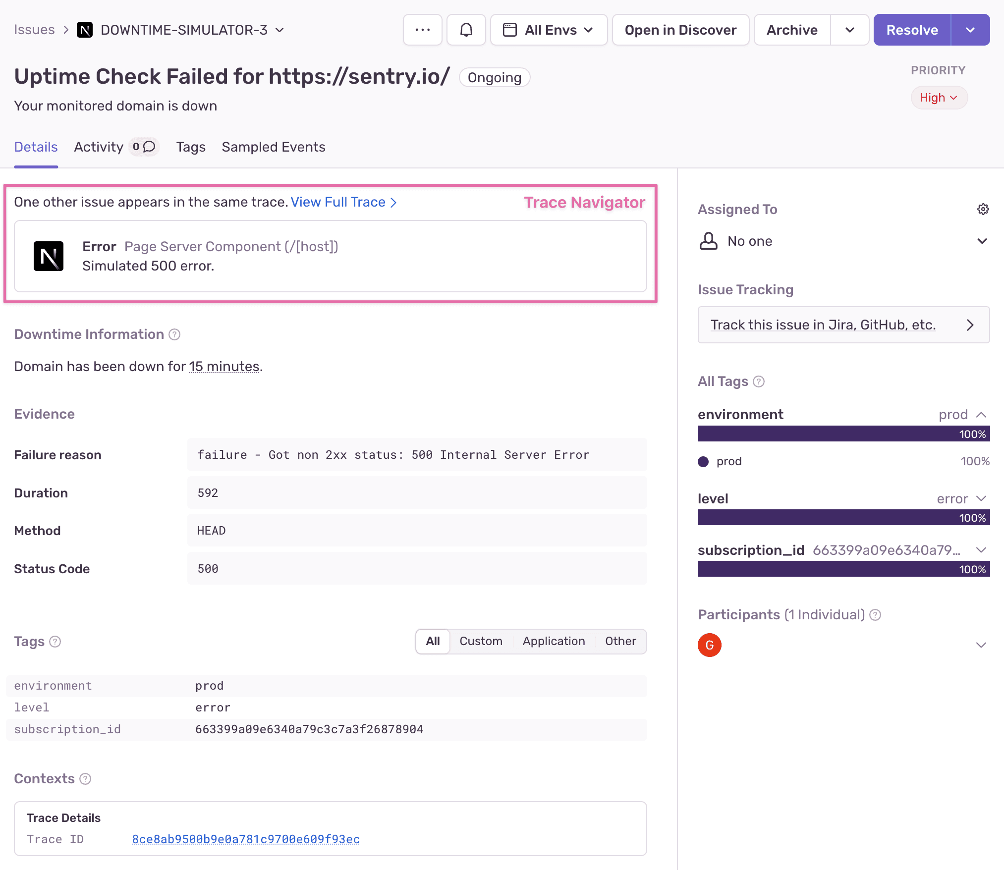 Uptime checks made against web services configured with one of Sentry's supported SDKs contain a trace that can be used to track detected errors resulting from failed HTTP uptime checks. The trace navigator allows you to browse through potential root causes of your downtime and is a powerful tool for quickly identifying and resolving issues.